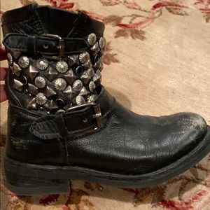 GREAT CONDITION! Black Ash rider boots with silver hardware detail on the side. Adjustable belt buckles. Distressed toes are part of the style - in excellent condition!