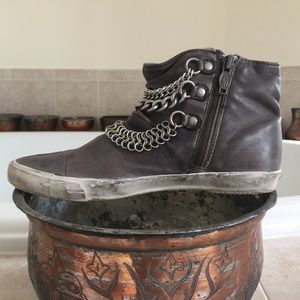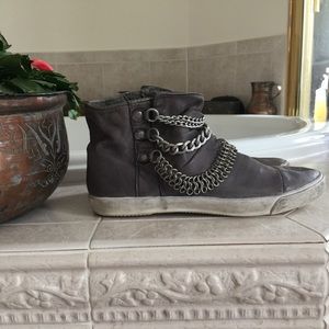 Ash Val chain detail leather low trainers in cement. White distressed soles with back ASH logo. Three metal silver chains, inside zipper. Size 36 but this style runs big so it can fit a 36.5 and 37. Perfect condition!