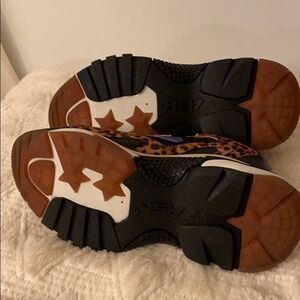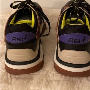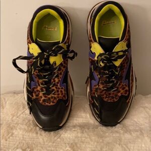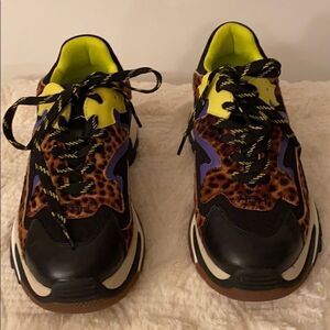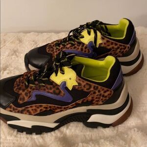 Leopard Print Pony Hair & Black Mesh The Ash Addict sneakers are a 90's inspired style constructed from leopard printed pony hair & yellow leather with nubuck leather panels in purple & black which sit on top of a mesh under layer. This buffalo sneaker style offsets the classic old skool appeal with it's exaggerated chunky rubber sole. If you are between sizes we recommend taking the smaller size for the best fit.