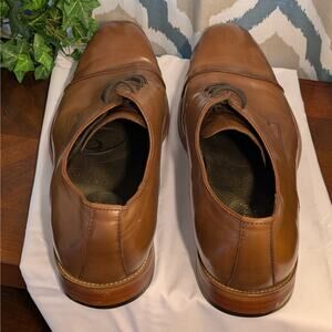 Asher Green leather Camel Brown lace-up cap-toe Oxford dress shoes in men's size 14. These handsome oxfords have a cap-toe and dark brown laces for timeless style. They are in very good condition. The inside heel of the left shoe has some light scuffing and the outside heel of the right shoe has some wear. There is also an indention on the bottom of the right shoe. Please see photographs for details. They are a very classy pair of classic Oxfords!