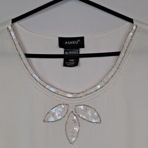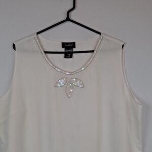 White, size 20W. Round neck pullover with beading and sequin embellishments on front neckline. Fully lined. 100% polyester. Measures 26" pit to pit, length is 27".