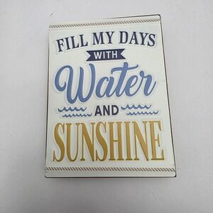 Charming tabletop decor sign featuring the quote "Fill My Days With Water and Sunshine." The sign is designed with a white background, blue lettering for "Fill My Days With Water", and gold lettering for "Sunshine", accented with decorative wavy lines. Its compact size makes it a perfect addition to any shelf, desk, or side table, adding a touch of positivity to your living space. Ideal for brightening up a home office, adding charm to a kitchen, or as a thoughtful gift for someone special.