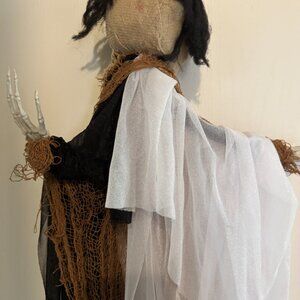 Creepy hanging clown decoration with skeleton hands and tattered fabric.