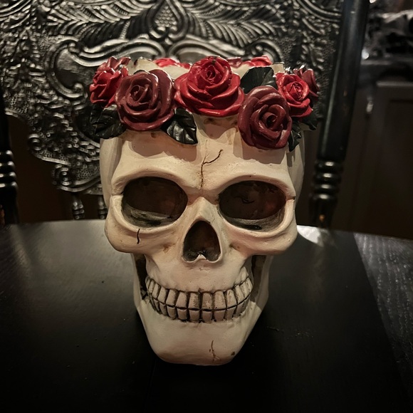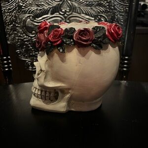 Iconic skull vase from Ashland’s Halloween collection (from a few years back) featuring a detailed skull adorned with deep red roses and dark foliage. A perfect statement piece for gothic, witchy, or Halloween décor lovers.