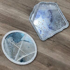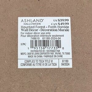 From Michael's "Ashland Haunted Forest" Halloween collection. Oval, textured silver frame measures 14" x 11.5". Real glass mirror with bluish image of a thin, gray-haired woman with creepy eyes printed on surface. Wrapped in faux spider web. 2 options for hanging. Mirror is cracked, but it only adds to the aesthetic.