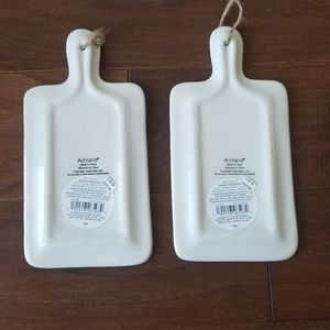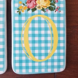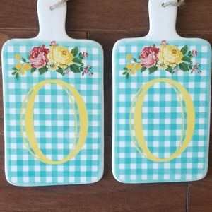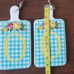Ashland letter "O" decorations. These tabletop or shelf decorations all have the O initial on them. This includes 2 "cheese boards" that retail for $9.99 each and 1 little O square tabletop decoration that retails for $7.99. There are a few normal imperfections with the glaze like the tiny black spot in the last picture but they have never been used and are brand new!