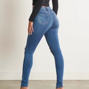High-rise skinny jeans featuring subtle knee distresses, tinted vintage wash throughout, classic 5-pockets and zip-fly closure.