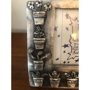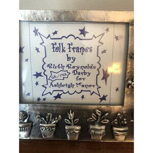 This is a pewter picture frame with flower pots and flowers around the edges from Folk Frames by Ruth Reynolds Darby for Ashleigh Manor. Exterior size is approximately 6.75" x 5". Appears to hold a 4"x3.5" photo. Very good condition.