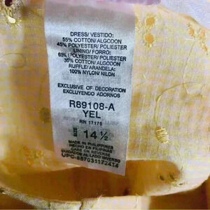 Ashley Ann Embroidered Eyelet Yellow and White Small Checked Sleeveless Sundress Lined Tulle Hem Girls Size 14 1/2. Adorable yellow ribbon bow detailing. Zipper on backside. Very small dot stain on inside lining (see photo). See photo for measurements.