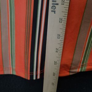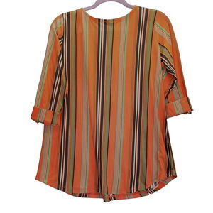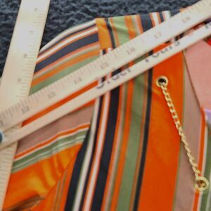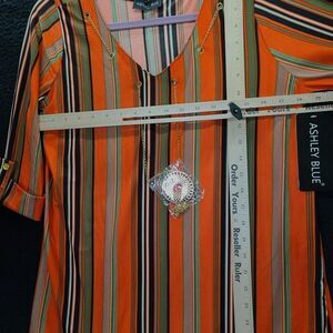 This Ashley Blue women's blouse, size medium, is a stylish, multicolored tunic with a striped pattern. Made from a 95% rayon blend, it features roll tab sleeves and an attached necklace for a unique, fashionable look.