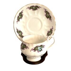 Vintage Ashley English Bone China tea cup & saucer set. Shapely cup and textured saucer with elegant purple green & white floral border pattern. Gold highlights on both pieces. Clearly hallmarked. In excellent vintage condition - no damage or flaws.