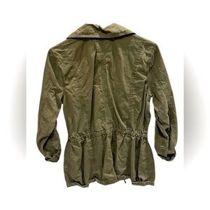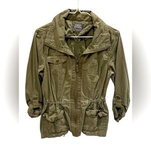 Stylish olive green utility jacket with button details. Perfect for casual outings.