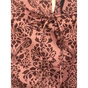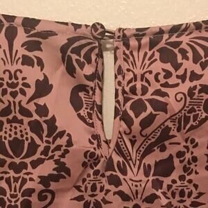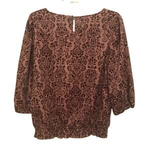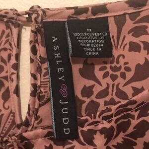 Ashley Judd women's blouse. Very soft and satin e. Features three quarter length sleeves with elastic. Front set in yoke with small self tie bow. Elastic ruffled waist. Colors of mauve and brown. Keyhole button closure in back. Great for date, school, or work. Spring, summer, or fall wear. Size Medium.