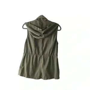 Olive green hooded cargo utility vest, Olive green with 5 snap closure pockets and drawstring waist.