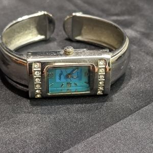 Silver toned , bangle style band , spring action, blue face, new battery and runs great. 7" in circumference