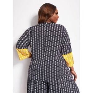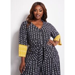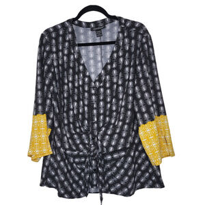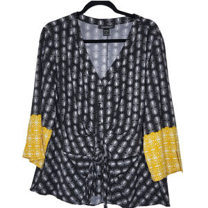 Ashley Stewart Abstract Black Yellow Front Tie Button Front Top Blouse Sz 18