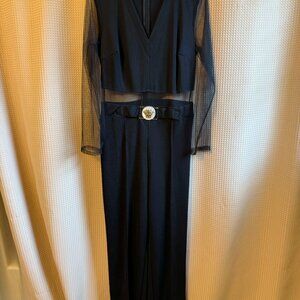 Elegant and modern Ashley Stewart black jumpsuit, new with tags. Features sheer mesh long sleeves, a flattering deep V-neckline, and a chic waist cutout for a sophisticated silhouette. The wide-leg design adds movement and flow, while the included statement belt with gold medallion buckle adds a luxe touch.