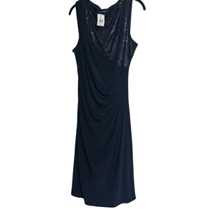 This Ashley Stewart sequined draped midi dress is black with a sequined bodice. The dress is made of a jersey-like material and features a draped design with side ruching . It has a sleeveless design and a midi length. The dress is approximately 40 inches long. NWT.
