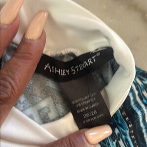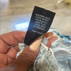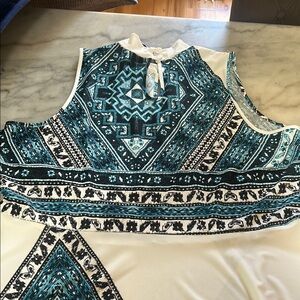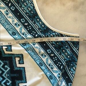 Stylish midi dress with bold blue geometric patterns. Sleeveless and elegant.