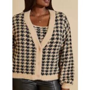 Ashley Stewart Cardigan 10 12 Black & Tan Houndstooth Cropped Mohair Extra Soft, New with Tags. Retail $64.50. 3 button closure. No flaws, Cropped, fuzzy and as soft as a rabbit! Measures when buttoned up 22" across the chest, 20" across the waist, and 20" long. Thank you for looking, we always ship fast!