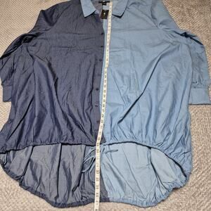 Ashley Stewart Denim Shirt Dress Women's 30/32 Blue Colorblock Hi-Low Drawstring Trim Button Closure 65% Cotton 35% Polyester