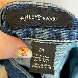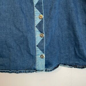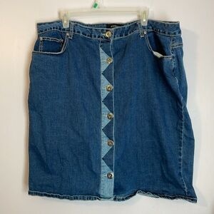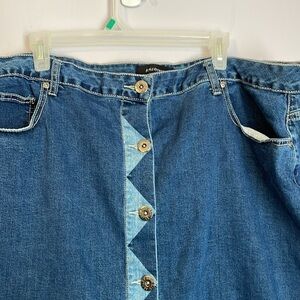 Ashley Stewart Denim Southwest Diamond Design Button Front Mini Skirt size 24. Good preowned condition. Cut diamonds different washes denim down button area on front. Pockets on front and back. Cute more western style. See pictures for measurements. Minor wash wear.