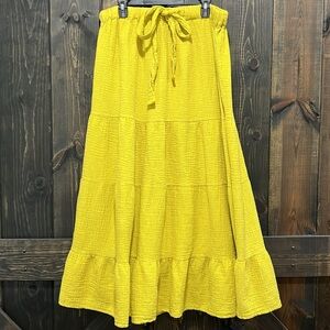 Ashley Stewart brand bohemian maxi set. Size 18/20. Yellow. Maxi length skirt with matching flutter sleeve top. Gauzy stretch material. Tie waist & back. Tiered design. Flared. Ruffle details. This listing is for both pieces. Preloved. Please see all photos for condition. Spot on back of skirt (pictured) that may or may not be removeable with wash. I tried to photograph the spot as close & detailed as possible but it washed out the color.