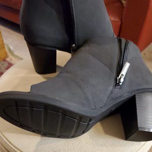 Never worn, Black, open toe, nubuck style, stack heel , shootie with side cut out detail and zipper, rubber outsoles, from Ashley Stewart.
