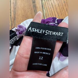 Elegant off-shoulder blouse with bold purple and black floral pattern. Ideal for casual or evening wear.