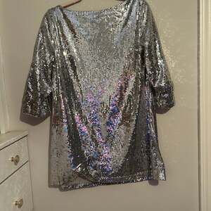 Sparkle and shine in this Ashley Stewart silver sequin tunic top, perfect for parties or a night out. This eye-catching top features dazzling silver sequins throughout and comfortable 3/4 sleeves. It's designed to be a stylish and flattering fit for plus sizes. Pair it with dark wash jeans or leggings for an effortlessly glamorous look.