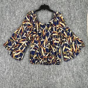 Ashley Stewart Women's Size 16 Blue Chain Print Blouse features stylish flare sleeves—perfect for party, club, or chic evening wear.