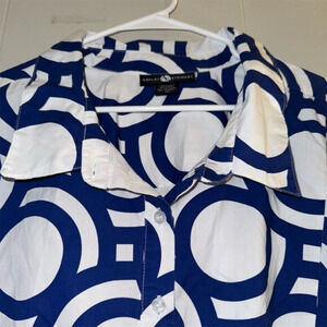 Keywords: Ashley Stewart, women's button-up, blue shirt, geometric pattern, casual wear, long sleeve, collared shirt, spring fashion, machine washable, pre-owned, regular fit, versatile, comfortable, office wear, brunch outfit.