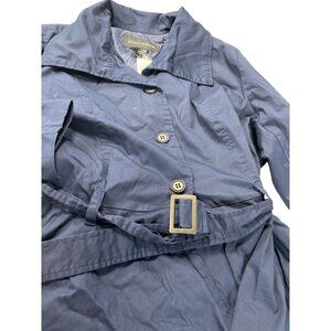 This Ashley Stewart trench coat offers a sophisticated look with its classic design and navy color. Made with a blend of cotton and spandex, it ensures comfort and flexibility. Ideal for professional settings, the coat's belted waist and buttoned cuffs add structure and style, making it a versatile choice for cooler weather. Unused with tags no defects. Length 41", shoulders 19.5", pits 24", waist 16". hem 37", sleeve length 24.5". SKU 9250