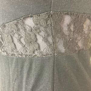 Amazingly sexy black dress that hugs curves and has black lace sexy neckline and front sides and slanted for figure flattering and vA vA voom Hollywood starlet dress. Even stretches to fit this larger sized mannequin which is 2x! EUC no flaws like new! Add jacket for office take it off for evening dinner and drinks🌷❤️feminine romantic sexy. Marked 14/16 I’m marking it 16. Armpit to armpit 22” before stretch shoulder to hem 38. Back zip.