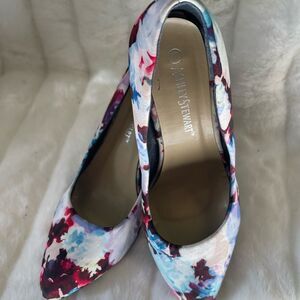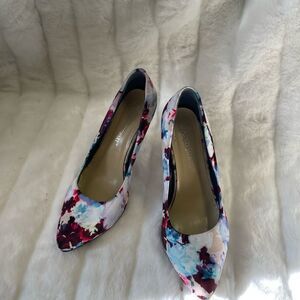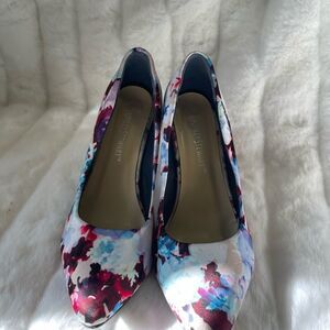Ashley Stewart colorful Satin slip on pointed toe gray heels size9W pre owned in good condition no tear normal wear see all pictures any questions please message