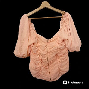 Size 2x cropped peach colored puff sleeve textured blouse. This blouse has beautifully detailing throughout with a gold exposed zip back.