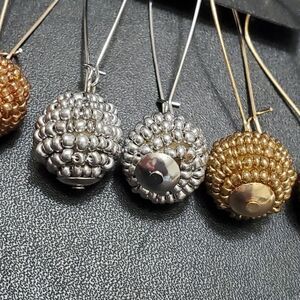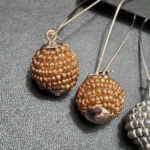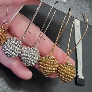 3 sets of earrings- one pair is silver colored, one pair is gold colored and the last pair is a darker gold color- almost bronze. The earrings are dangling balls made from seed beads.