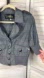 Genuine Y2K “Bomber” jacket with cropped length and sleeves, exaggerated collar, and large buttons with zipper detailing. Stretchy ribbed trim. Chambray fabric in gray with gunmetal colored buttons.