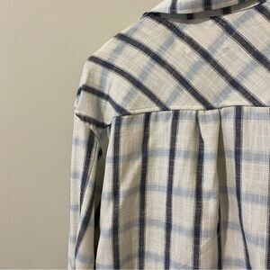 Get cozy in this large plaid shacket. This blue/navy plaid shirt features button down front, button chest pockets, basic collar style, long button sleeves and a hip length, curved hem. Wear this shirt jacket alone or over a graphic tee or tank with jeans.