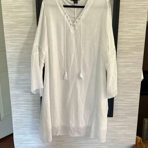 Ashley Stewart white gauze lined peasant dress/swimwear cover-up with front tassel size 18/20 plus size