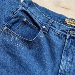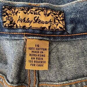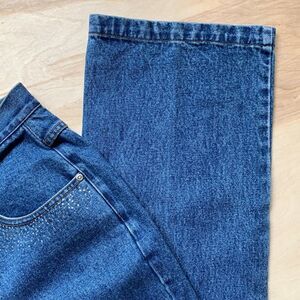 Beautiful Ashley Stewart high waisted jeans are heavyweight and medium blue. No stretch to fabric. They have gold stitching. Tiny rhinestones around front pockets. Five pockets. Front zipper with button closure. Boot cut. Waist flat across is 16”. Hips flat across is 22”. Inseam is 30”. New without tags.