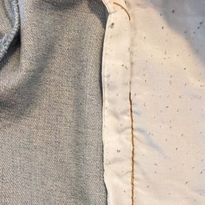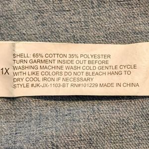 If you love the distressed, laid back look then this is your jacket!! It definitely has a ton of distressing featuring silver buttons on the front and cuffs, lots of shred and a frayed bottom hem. There are slant pockets on each side of the front and two chest pockets. It would look really cool with a white tank under it and some darker jeans.