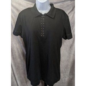 Bold yet dark black rhinestone collared shirt by Ashlyn Kate. It's made of a soft and durable black fabric. It has a fold over collar, and a 7 inch zipper starting at the neckline. Both sides of the zipper and the edges of the sleeves have clear silver backed rhinestone accents. Perfect for the office, going out, and outfits with a subtle touch of glam!