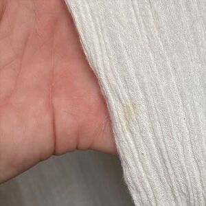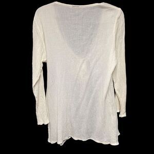 Beautiful, lightweight “crepe” blouse with tie front. Brand is Ashoka. There is a small stain on sleeve (pictured) Please see measurements below for fit. Measurements lying flat.