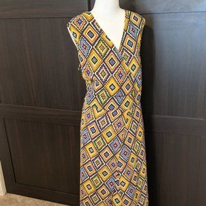 Wow the crowd in this bold, sunny-day staple. Surplice top, empire waist, and sweeping skirt with flowing overlay. 53" l. Lined. Polyester; machine wash.