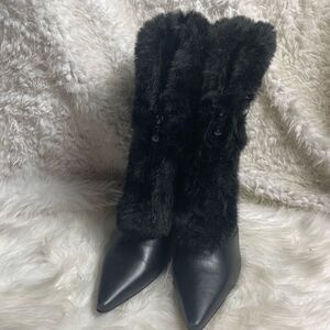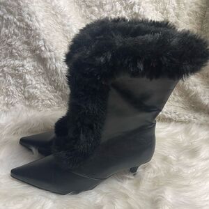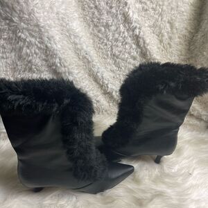 Ashro synthetic black mid calf boots faux fur trim front zipper 3”heels SZ11W pointed toe.pre owned in good used condition has some scratches on bottom side of the right boots not noticeable when wearing. See all pictures any questions please message.