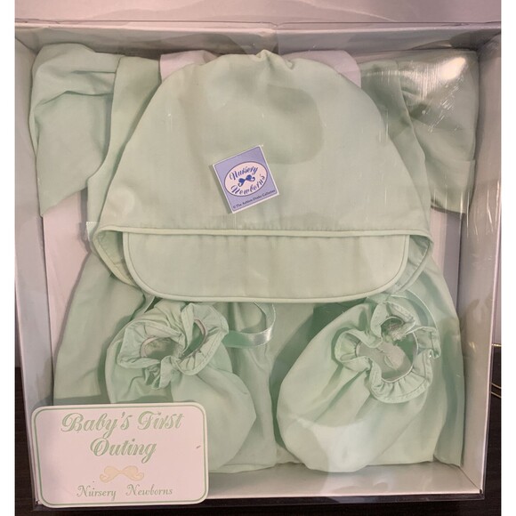 Adorable mint green outfit set by Ashton Drake Galleries made for Nursery Newborn dolls. Includes bonnet, mittens, and matching outfit. New and unused in original packaging. Box has been opened but item is in excellent condition.