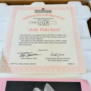 Ashton Drake doll with the Certificate of Authenticity for the "Just Hatched" all-porcelain doll from The Ashton-Drake