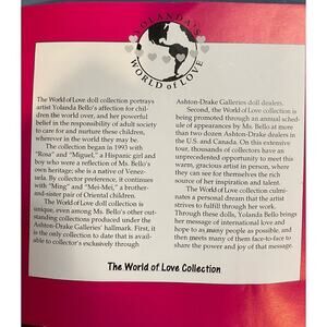Ming and Mei-Mei Porcelain Dolls were designed by artist Yolanda Bello for her '1994 Yolanda's World of Love Tour. The edition ended on December 31, 1994, and the molds were broken.