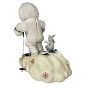 "Slip Slidin' " is an original issue in the Ashton-Drake SnowBabies collection by artist Titus Tomescu, and produced under the hallmark of Ashton-Drake. It is a sweet SnowBaby skiing down the snow covered hill with her friend the bunny rabbit on the back of her skis. The snow covered base is made of plastic.